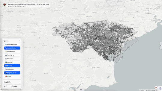 DECIDE-DSS is a prototype web-based application that follows the principles of universal design and outcome-driven decision-support strategies. It enables the visualisation of different layers of geospatial data and provides straightforward interpretation through essential KPIs and narrative functions. Its objective is to provide clear communication of the models’ outcomes to diverse stakeholders. The demonstration of the prototype provides analysis of Cardiff, in the United Kingdom; however, it is flexible enough to be used in any urban context.