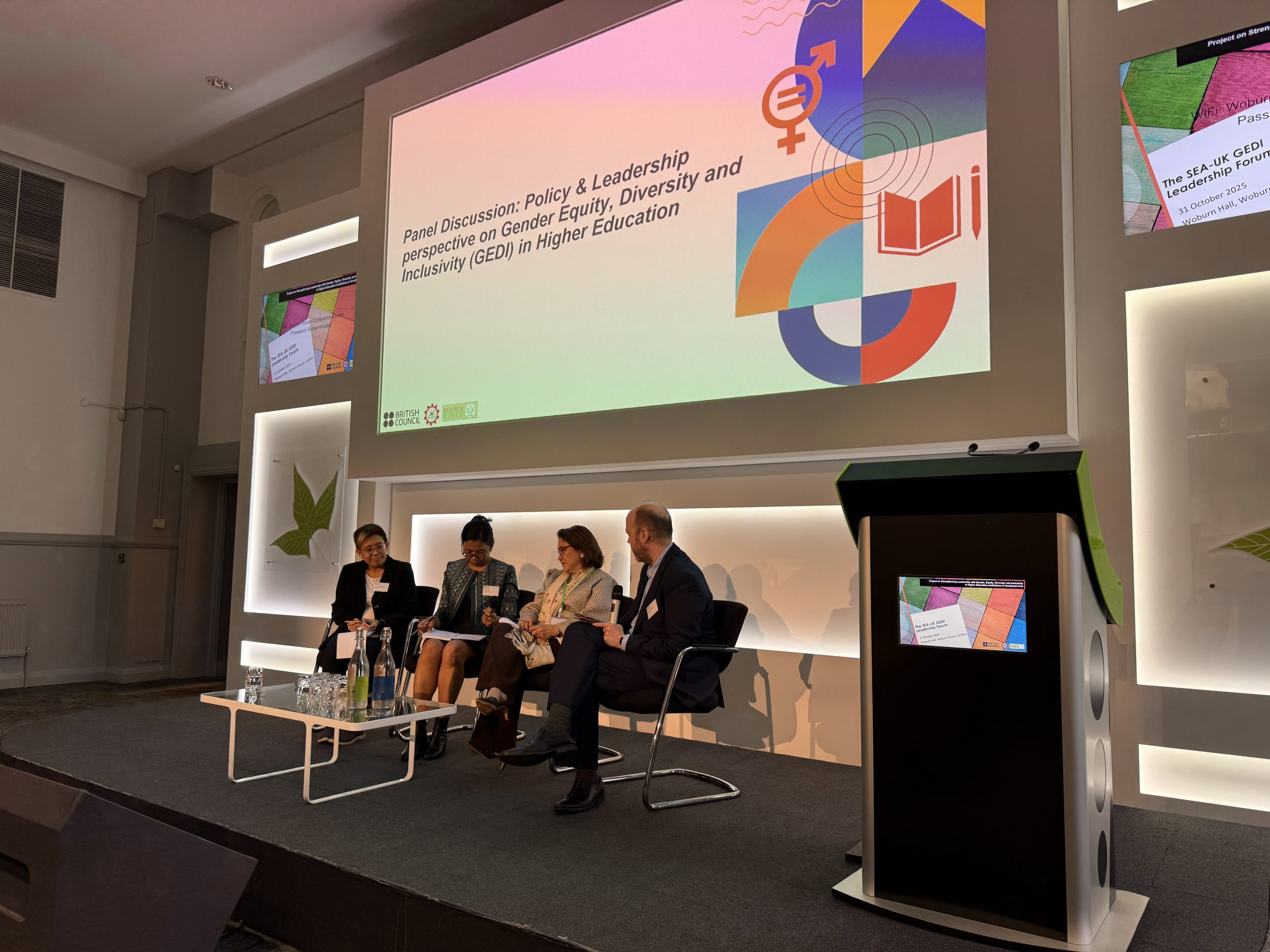 The welcome and opening remarks were followed by the first panel discussion: Policy and Perspective. This session explored how regional policy leaders were translating the principles of GEDI into action, reflecting on lessons from the White Paper and priorities for sustaining policy dialogue across Southeast Asia. This panel counted with representatives from Cambodia, Ms Bunry Rinna, Chief of the Office of Policy and Curriculum, Department of Higher Education Management, Ministry of Education, Youth and Sport; representing Philipines: Ms Edna Imelda Fernandez-Legazpi, Director IV/Regional Director, CHED MIMAROPA / Co-chairperson, CHED GAD Focal Point System, Commission on Higher Education and Dr Romyen Kosaikanont, Vice President, Mae Fah Luang University and Former Seameo RIHED Director. The image of the panel is in Figure 2.